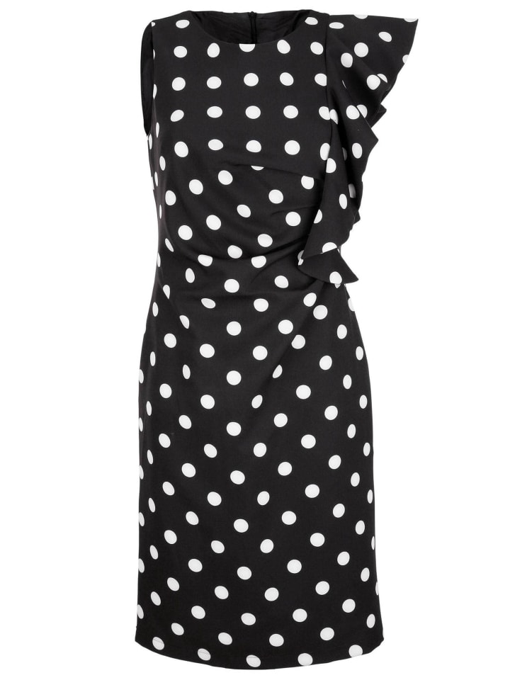 Особенно привлекательные детали включают узор в горошек и оборки. Платье имеет круглый вырез горловины. Приталенный силуэт создает привлекательный силуэт. Изготовлено из неприхотливого в уходе материала. В нашем интернет-магазине вы найдете огромный выбор товаров - закажите доставку этого повседневного платья Alba Moda прямо к вам домой!
