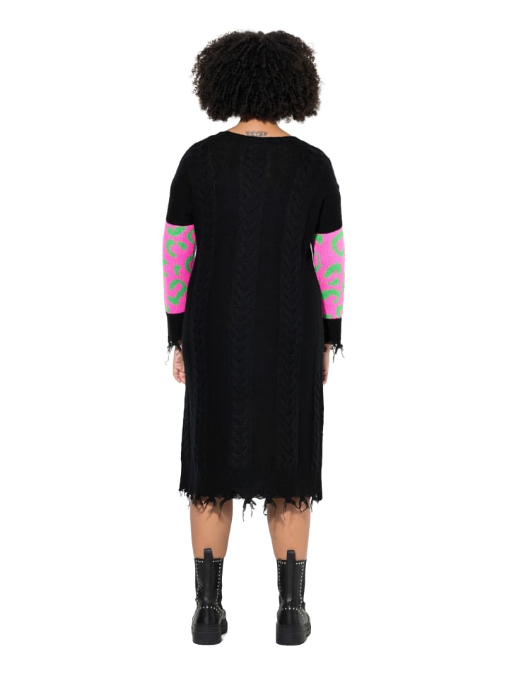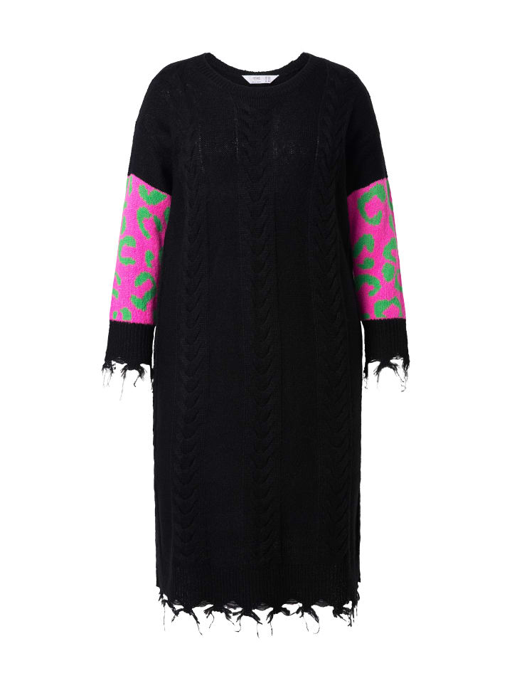 Вязаное платье миди прямого кроя с бахромой по низу и длинными рукавами, выполненное в ярком леопардовом принте. Спереди - крупная вязка, круглый вырез, приспущенные плечи, длинные рукава.