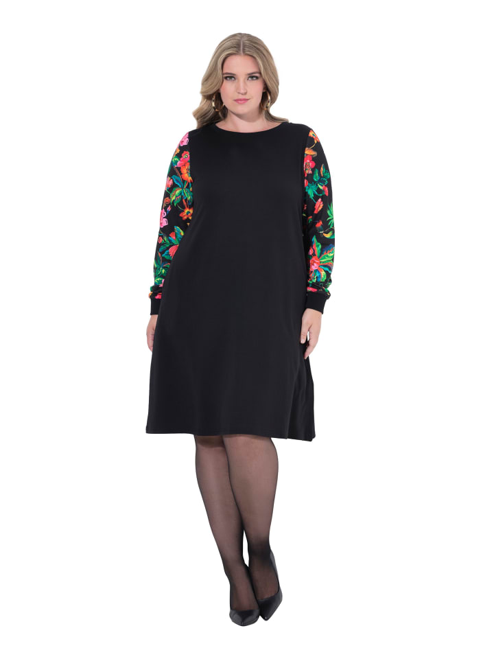 Короткое платье-свитшот А-силуэта из мягкой ткани для свитшотов с принтом на длинных рукавах. Вырез-лодочка, боковые карманы, удобная ширина подола.