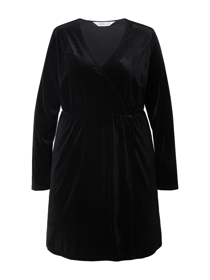 Бархатное платье слегка А-силуэта, из элегантно переливающегося бархата с запахом, V-образным вырезом и двухслойной юбкой спереди. Длинные рукава.