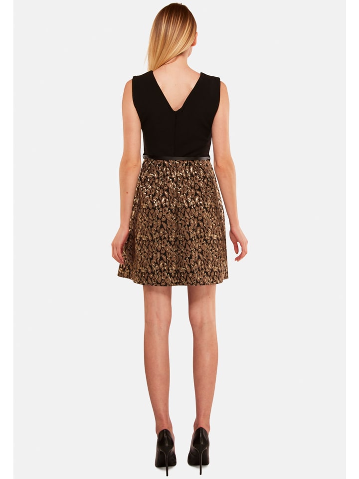 Элегантное женское платье без рукавов с юбкой с леопардовым принтом, черным топом и поясом на талии. Простой, но изысканный дизайн, подходящий для торжественных случаев.