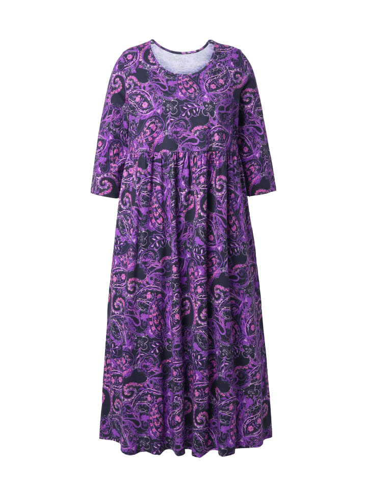 Длинное трикотажное платье А-силуэта с узором «пейсли». Удобный крой, круглый вырез горловины и эластичная завышенная талия. Рукава три четверти, боковые карманы.