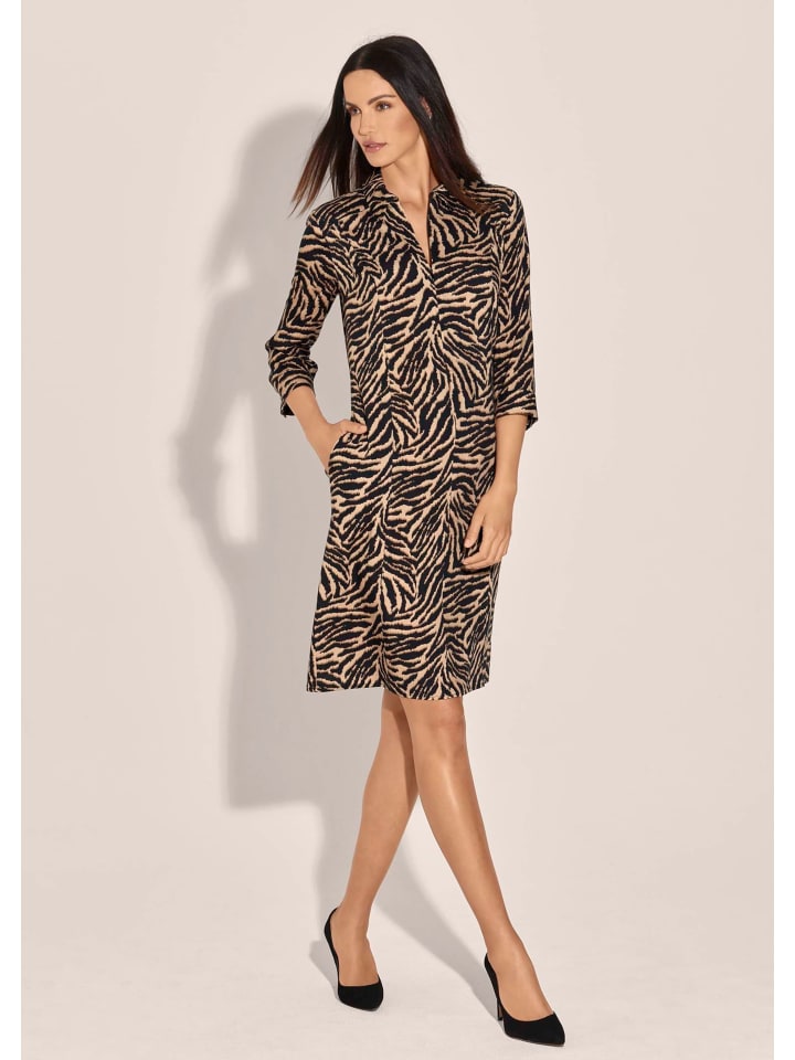 Платья - любимая летняя одежда, удивительно простая и удобная в носке. Как, например, этот очаровательный комбинезон, анималистический принт которого индивидуален, что делает каждое изделие уникальным. Сдержанный крой включает в себя воротник-стойку, рукава три четверти и боковые карманы. Незаметная молния на вырезе горловины обеспечивает удобство надевания. - Воротник-стойка - Рукава три четверти - Машинная стирка - Длина около 98 см, до колена. Материал: 100% вискоза