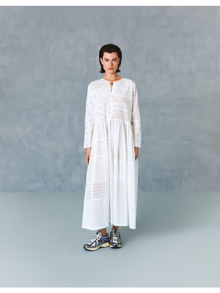 Это фантастическое длинное платье с подходящей нижней юбкой сочетает в себе три разных вида вышивки и очаровывает своим летним шармом. Перламутровые пуговицы и одна эмалированная пуговица на лифе завершают образ. Поистине сказочное платье, которое будет радовать вас долгие летние сезоны. - 100% хлопок - Сделано в Индии - Рост модели 178 см/5'10", размер 36
