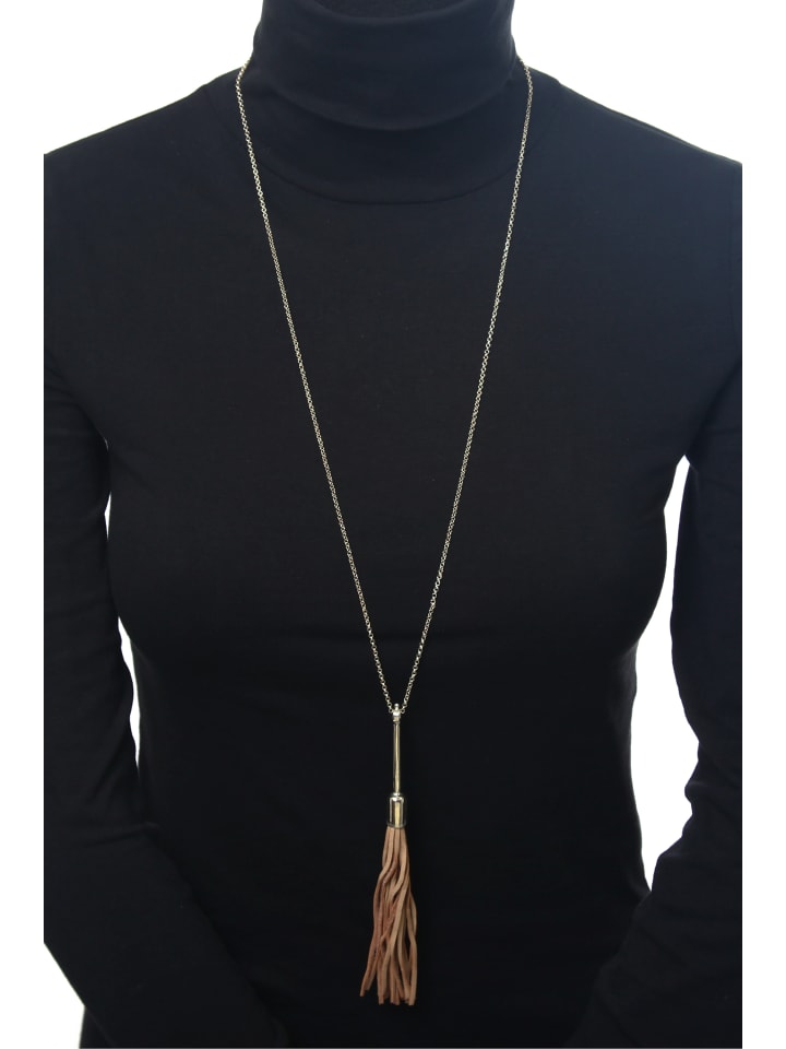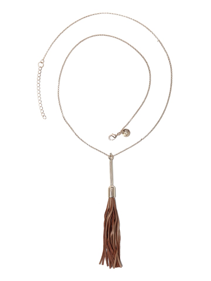 Это элегантное длинное колье, состоящее из тонкой цепочки якорного плетения и кисточки из натуральной кожи, дополнит любой образ. Колье доступно в розовом золоте (матовая отделка) и золоте (полированная отделка) и соответствует требованиям REACH. Добавьте нотку сдержанной элегантности своему образу с помощью этого колье. - Цепочка якорного плетения цвета розового золота - Длина около 81 см плюс 7 см удлинительная цепочка - Матовая отделка - Подходит к любому наряду - Соответствует требованиям REACH