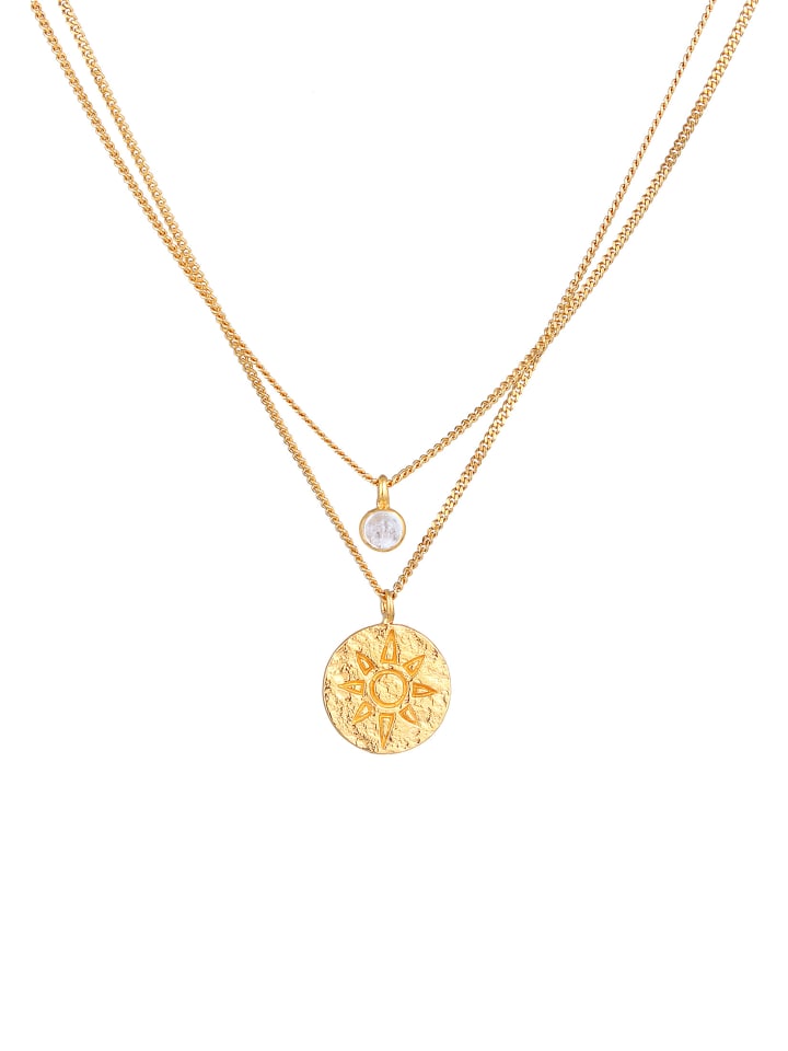 Это многослойное колье с подвеской, изготовленное вручную из позолоченного серебра 925 пробы, великолепно подчеркнет декольте женщины. В центре короткой цепочки расположен красивый кулон с лунным камнем. Более длинная цепочка украшена сияющей подвеской в виде монеты с солнечным мотивом, что придает изделию гармоничный и летний вид. Этот потрясающий аксессуар - летний тренд, обладающий стильным очарованием.