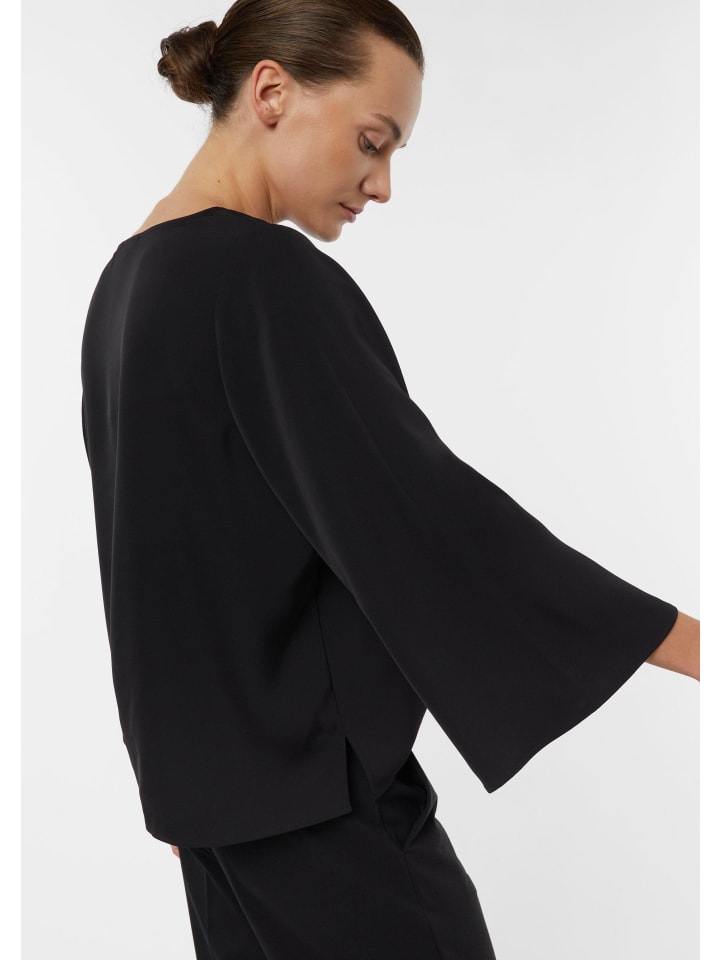 Эта струящаяся блузка свободного кроя впечатляет широкими рукавами-кейпами длиной три четверти и женственным U-образным вырезом. Высококачественная креповая ткань, изготовленная из легкого материала, выгодно подчеркивает фигуру и обеспечивает элегантную драпировку. Боковые разрезы по низу добавляют современный штрих. Идеально подходит для деловых встреч или торжественных случаев - сочетайте блузку с узкими брюками или юбкой для стильного образа. Особенности: - Свободный крой - Струящаяся креповая ткань - U-образный вырез - Широкие рукава три четверти - Боковые разрезы по низу. Материал: - 97% полиэстер - 3% эластан
