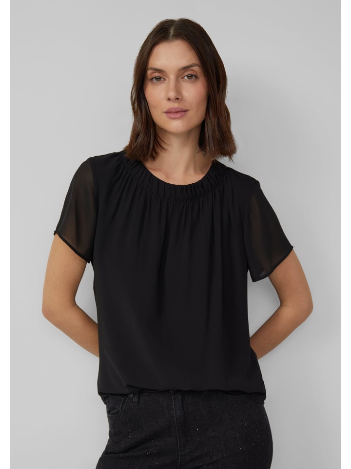 Легкость сочетается с изысканностью: эта шифоновая блузка впечатляет стеганой драпировкой и элегантным круглым вырезом с разрезом и пуговицей. Классический крой подчеркивает фигуру, а воздушная ткань обеспечивает комфорт при ношении. Будь то офис или неформальный ужин, она подчеркнет ваш уверенный стиль непринужденной элегантностью и вневременной привлекательностью. - Классический крой - Шифон - Разрез и пуговица на вырезе, круглый вырез - Короткие рукава - Особенно подходит для деловых встреч Материал: 100% полиэстер