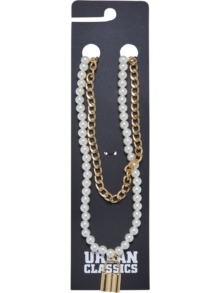 Это элегантное колье состоит из двух разных цепочек, каждая из которых имеет свой неповторимый стиль. Одна цепочка представляет собой сверкающую нить жемчуга, а другая дополняет ее золотистым оттенком. К жемчужной цепочке прикреплен золотистый кулон в форме замка. Удлинительная цепочка позволяет регулировать длину двухрядного колье.