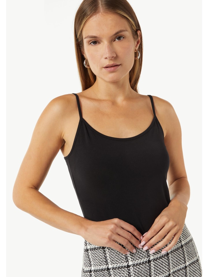 Эта облегающая футболка без рукавов станет идеальным базовым слоем для вашего образа. U-образный вырез и регулируемые бретели обеспечивают оптимальный комфорт и индивидуальную посадку. Благодаря эластичной трикотажной ткани из хлопка, модала и эластана, футболка мягко облегает фигуру. Ее можно легко носить под пиджаком для делового образа или отдельно для расслабленного, повседневного стиля. - Облегающий крой - Трикотажная ткань - U-образный вырез - Регулируемые бретели, без рукавов Состав: - 57% хлопок - 37% модал - 6% эластан