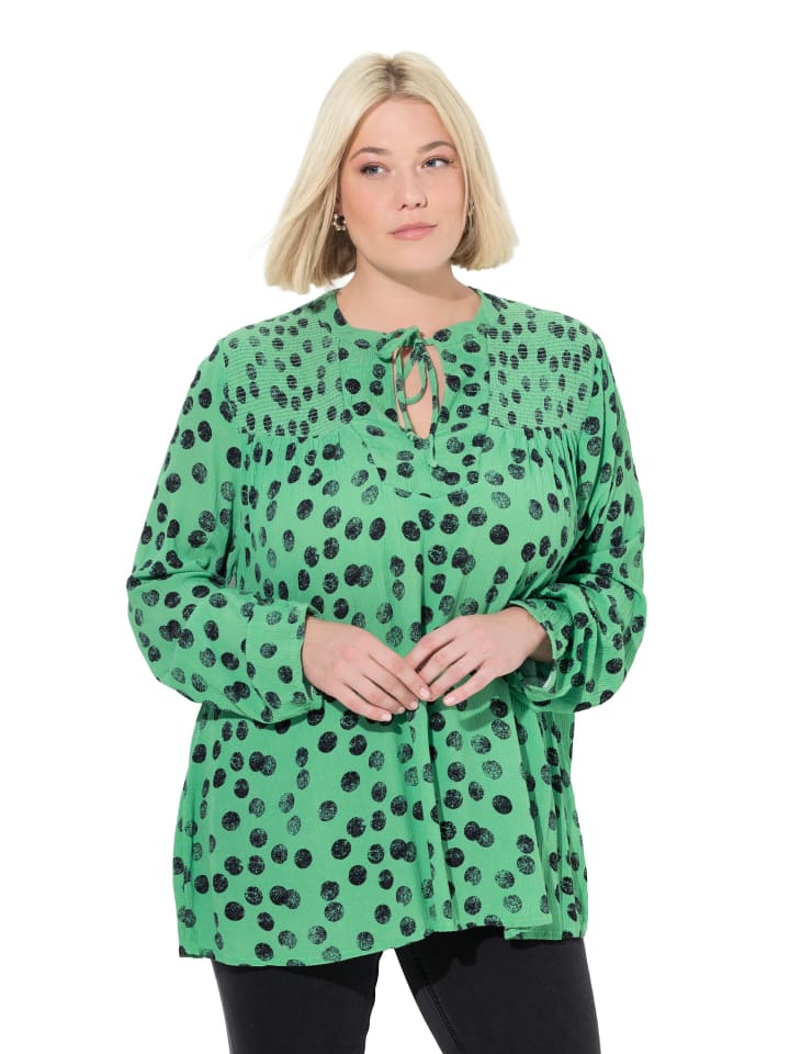 Блузка с присборенным верхом, А-силуэта, из мягкого крепа с узором в горошек. Вырез туники с завязками, эластичные присборенные плечи, длинные рукава с эластичными манжетами.