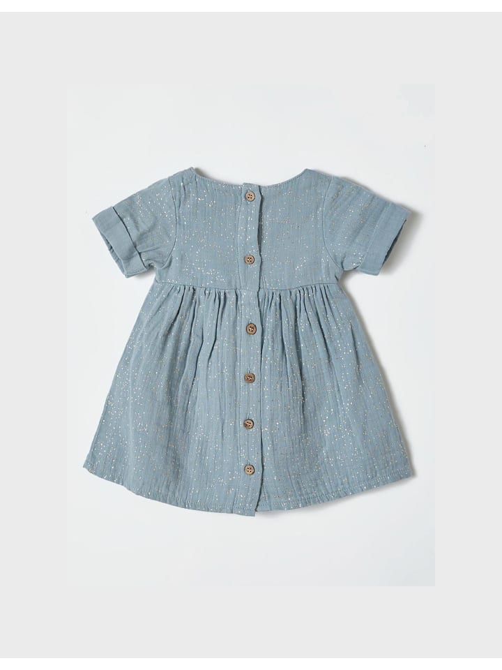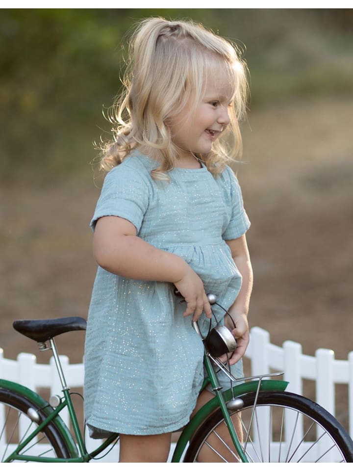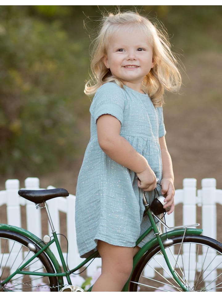 Это милое детское платьице сшито из мягкого, дышащего органического муслина с добавлением блесток для легкого мерцания. Платье с короткими рукавами, свободным кроем подходит как для повседневной носки, так и для особых случаев. Изготовлено из 100% органического хлопка, нежно воздействует на кожу малыша и не содержит вредных химических веществ. Бирюзовый цвет и легкие блестки делают его игривым и сверкающим, а ткань становится мягче с каждой стиркой, обеспечивая длительный комфорт. - Мягкое и приятное для кожи - Изготовлено из 100% органического хлопка, не содержит вредных химических веществ - Игривое и сверкающее - Легкий эффект блесток для особого образа - Удобный крой - Свободный силуэт с короткими рукавами для максимальной свободы движений