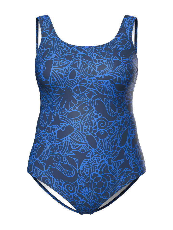 Купальник без мягких чашечек. С принтом на подводную тематику, круглым вырезом, поясом под грудью и мягкой подкладкой спереди.