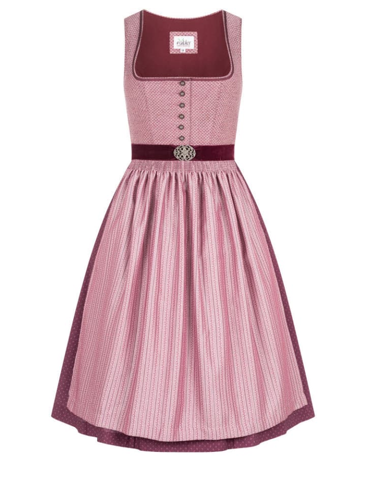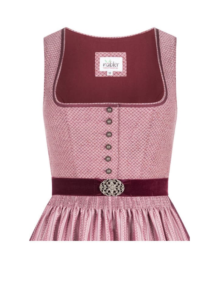 Ищете традиционный, элегантный дирндль? Тогда наш дирндль Lohe midi ягодного цвета от Nübler - идеальный выбор. Квадратный вырез лифа обрамлен контрастной отделкой, которая прекрасно подчеркивает декольте. Дирндль застегивается спереди на планку с пуговицами под старинное серебро, которая подчеркивает тонкий ромбовидный узор. Юбка украшена нежными цветочными принтами, придающими платью романтический вид. Два боковых кармана обеспечивают удобное хранение необходимых вещей. Настоящим украшением является потрясающий фартук с полосатым узором в виде лозы, бархатными завязками и пряжкой в винтажном стиле. Этот дирндль позволит вам выглядеть шикарно в любой ситуации, излучая элегантность. Совет: Хотите завершить свой образ с дирндлем? Мы рекомендуем добавить в свою коллекцию подходящий бюстгальтер или блузку для дирдля. Бюстгальтер идеально подчеркнет ваше декольте и придаст вашему дирнделю соблазнительный вид. Блузка к дирндли, с другой стороны, позволяет добавить романтичный или игривый штрих. Закажите бюстгальтер или блузку к дирндли прямо сейчас и завершите свой сказочный традиционный наряд. Информация о доставке: Если не указано иное, наши дирндли доставляются без блузки, соответствующих аксессуаров и обуви. Инструкции по уходу: деликатная стирка при 30°C, глажка при низкой температуре. Для дополнительной защиты положите хлопчатобумажную ткань между изделием и утюгом.
