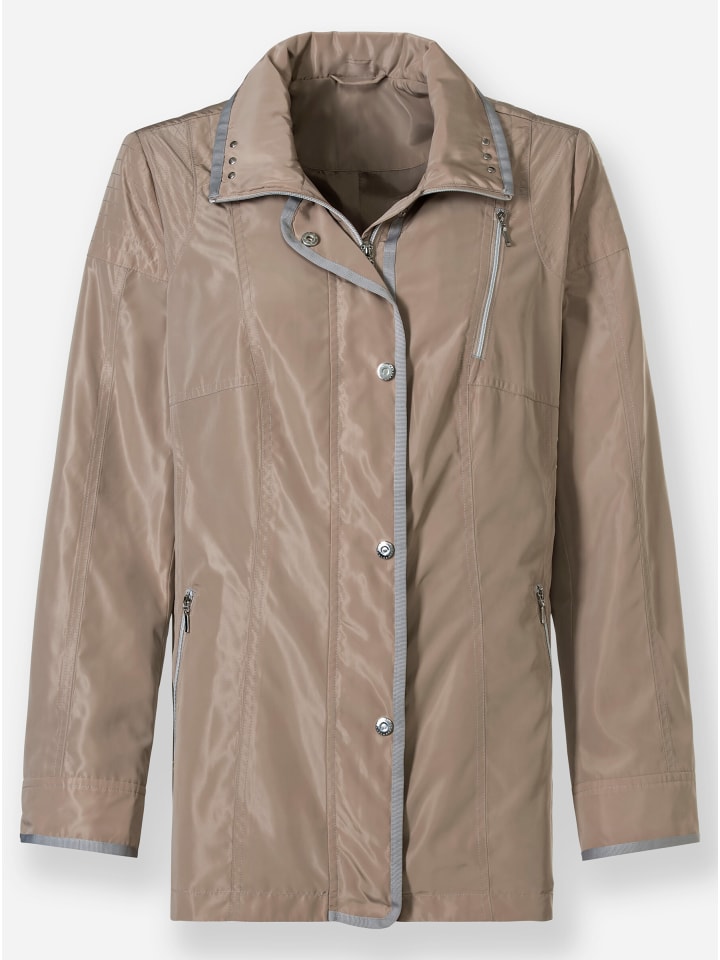Легкая, слегка мерцающая куртка для переходной погоды с множеством деталей. Цветная лента из грогрена проходит вдоль регулируемого воротника, планки на кнопках вдоль молнии и манжет на кнопках. Дополнительные декоративные элементы включают серебристые заклепки и кнопки, а также контрастную строчку. Три передних кармана на молнии и один внутренний карман на пуговице. Особенности: - множество практичных карманов - детальная работа - слегка мерцающая ткань. Материал: 100% полиэстер