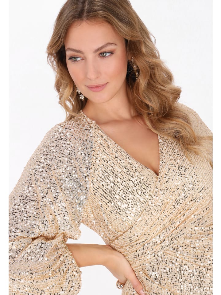 Ослепительное платье-халат из коллекции Faina, созданное для особых случаев. Это платье прямого кроя средней длины с V-образным вырезом и элегантными рукавами-епископами придает образу легкость и женственность. Изготовленное из нежной сетки, украшенной сверкающим узором из пайеток, оно имеет легкую драпировку, подчеркивающую силуэт. Идеально подходит для праздничных и вечерних образов, сочетая в себе элегантность, блеск и комфорт.