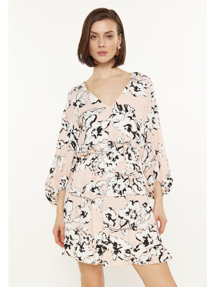 Вдохновитесь стилем с этим модным мини-платьем с развевающимся V-образным вырезом и рукавами 3/4, собранными у запястий. Эластичная талия обеспечивает стандартный крой, а оборки по низу добавляют изящества. Изготовленное из тканого материала с ярким цветочным принтом, оно идеально подходит для повседневной носки в нашей весенне-летней коллекции - непринужденное, но стильное!