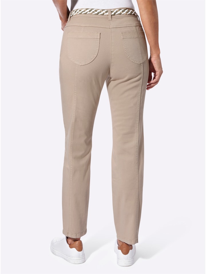 Повседневные брюки с анатомическим поясом, шлевками для ремня и застежкой на пуговицу и молнию. В комплекте идет красивый плетеный пояс! Кокетка сзади и эластичная ткань обеспечивают отличную посадку. Два прорезных кармана на молнии спереди и два накладных кармана с декоративной строчкой сзади. Ширина штанины внизу около 36 см. Поддерживает инициативу «Хлопок, произведенный в Африке».