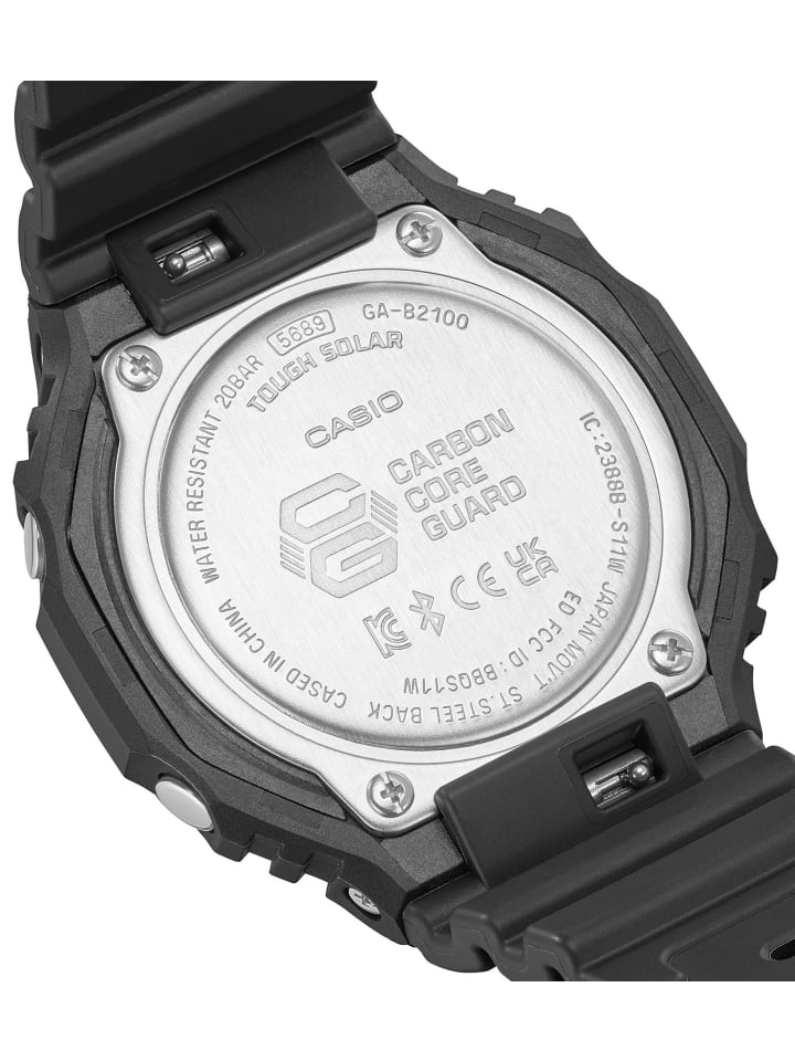• Ударопрочные мужские наручные часы с аналоговым и цифровым отображением времени • Кварцевый механизм с солнечной батареей • Подключение смартфонов по Bluetooth • Автоматический календарь с датой, месяцем и днем недели • Многоязычное отображение дня недели • 12/24-часовой формат • Функция мирового времени для 29 различных часовых зон • Секундомер до 24 часов с шагом 1/100 секунды • Таймер обратного отсчета до 24 часов с шагом 1/1 секунды • 5 ежедневных будильников • Функция перемещения стрелок для беспрепятственного обзора дисплея • Включение/выключение звуковых сигналов клавиш • Поиск телефона • Черный циферблат • Светящиеся стрелки • Рельефные индексы • Сверхъяркая цветная подсветка • Корпус из черной полимерной смолы, усиленной углеродным волокном • Завинчивающаяся задняя крышка Корпус из нержавеющей стали
