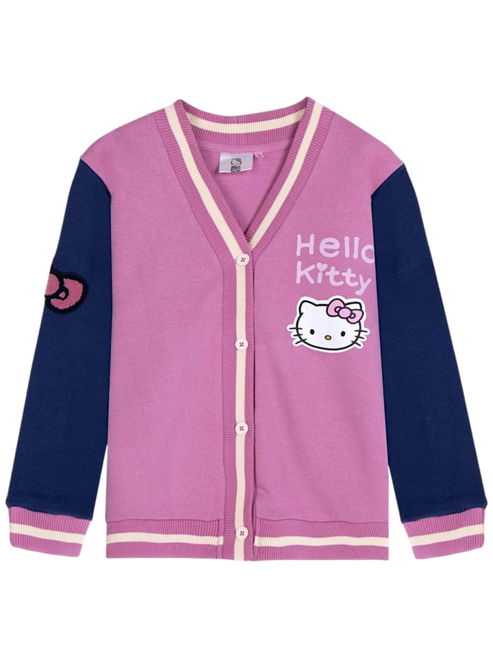 Маленьким поклонницам Hello Kitty обязательно понравится этот очаровательный кардиган. Розовая куртка с темно-синими рукавами и ярким принтом спереди добавит красок и радости в повседневную жизнь. Мягкий хлопок обеспечивает приятное тепло и комфорт. Практичная застежка на пуговицах и спортивный бейсбольный стиль делают его любимым аксессуаром для детского сада, школы и отдыха. Материал: 100% хлопок. Инструкции по уходу: Бережная стирка при 30°C, не гладить при высокой температуре (110°C), не сушить в сушильной машине.