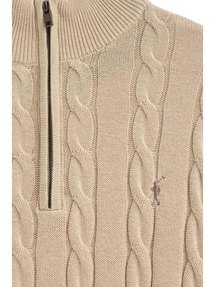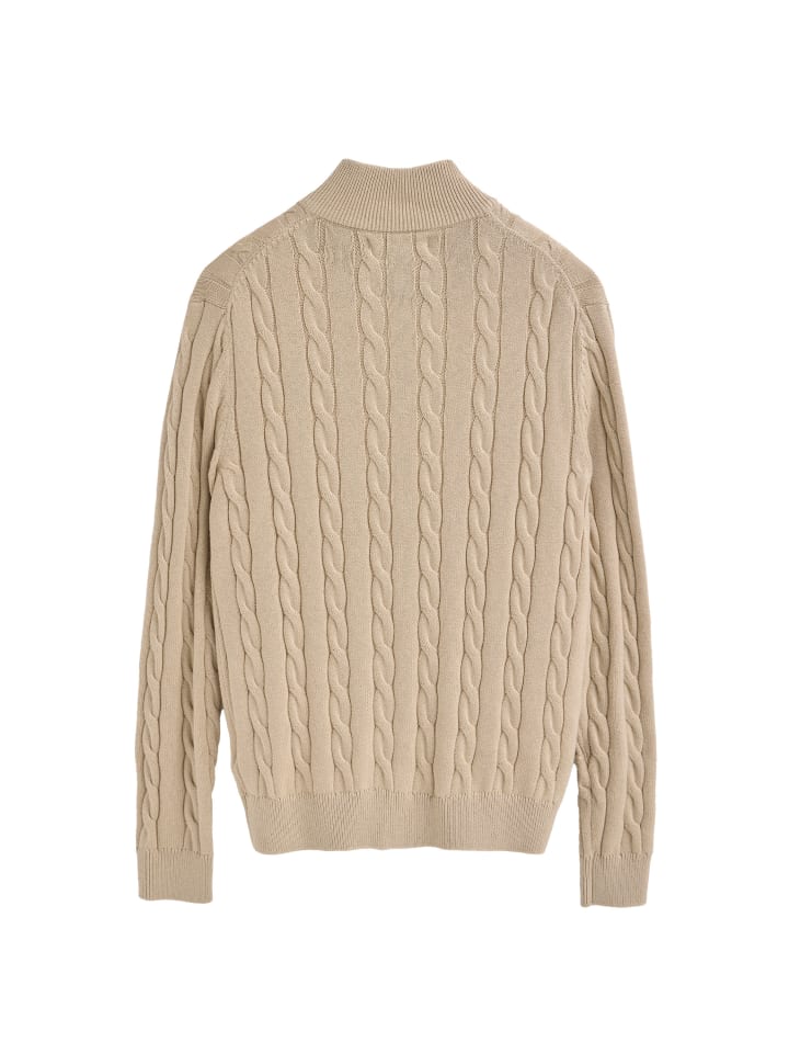 Мужской свитер с длинными рукавами, застежкой-молнией до середины воротника и прямым кроем. Изготовлен из теплой смеси шерсти и хлопка с узором «косичка». Универсальная и вневременная вещь.