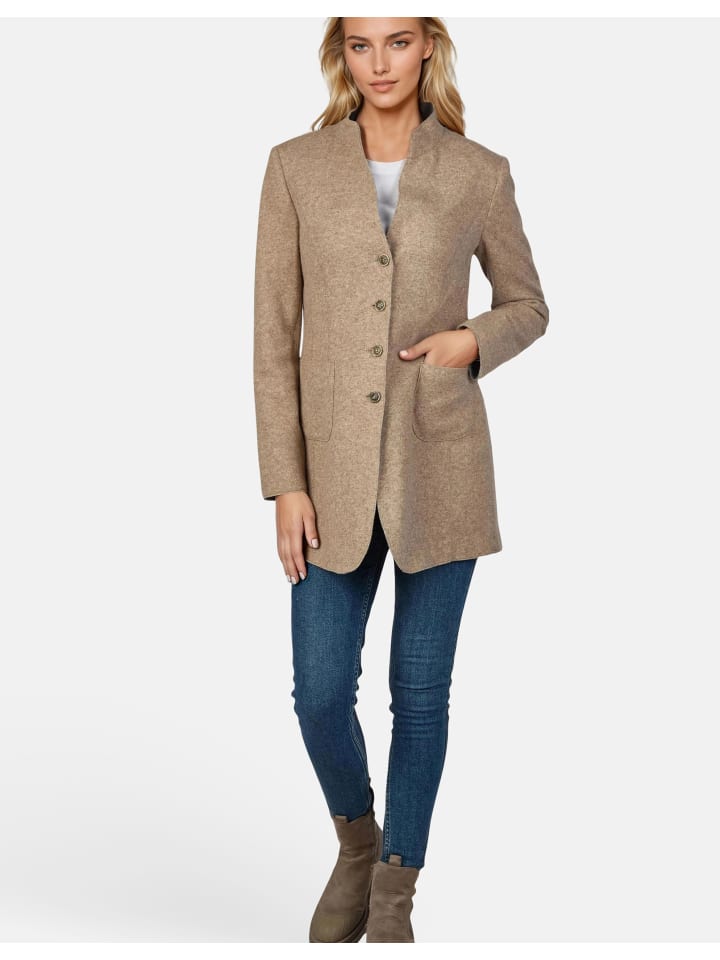 Элегантный, современный и продуманный до мелочей - этот длинный женский блейзер со стоячим воротником идеально подойдет для городского стиля жизни. Края с отделкой «taglio vivo» на прорезях карманов, переднем крае, подоле и воротнике придают блейзеру чистые, минималистичные линии, а накладные карманы и швы с декоративной обтачкой добавляют стильные детали. Благодаря частичной подкладке блейзер обеспечивает легкость и свободу движений, а внешняя ткань, частично изготовленная из переработанных материалов, сочетает в себе экологичность и современный дизайн. Ключевой элемент гардероба для уверенных в себе женщин, которые хотят сочетать повседневную элегантность, функциональность и осознанный образ жизни - достаточно универсальный, чтобы сочетаться со всем, от офисных образов до городского шика. - Блейзер/Флис - Стоячий воротник - Накладные карманы - Частичная подкладка - Длина (размер не указан) 38: 80 см