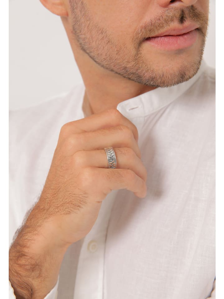 Это мужское кольцо шириной 7 мм, изготовленное вручную из цельного серебра 925 пробы, подчеркнет непринужденный, расслабленный образ. Прямой ободок кольца украшен узором, напоминающим елочку. Частично затемненная поверхность добавляет яркий визуальный акцент. Эффектное украшение на каждый день, идеально дополняющее индивидуальный стиль мужчины.