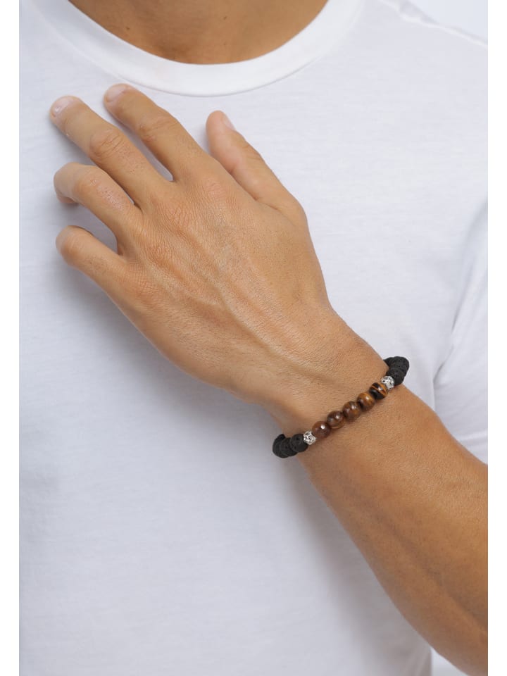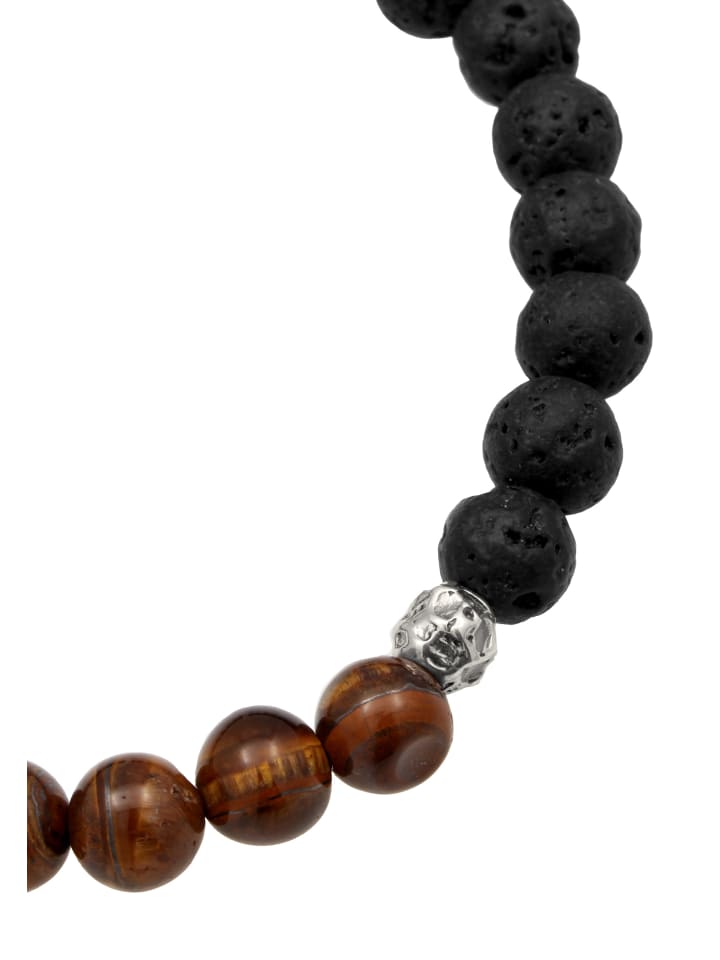 - Браслет из серебра 925 пробы с тигровым глазом и лавовыми камнями добавляет мужественности.