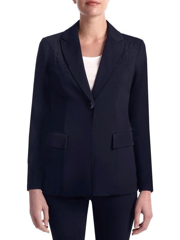 Украшенный вышивкой в ​​виде звезд, этот блейзер с заостренными лацканами и однобортным фасоном.