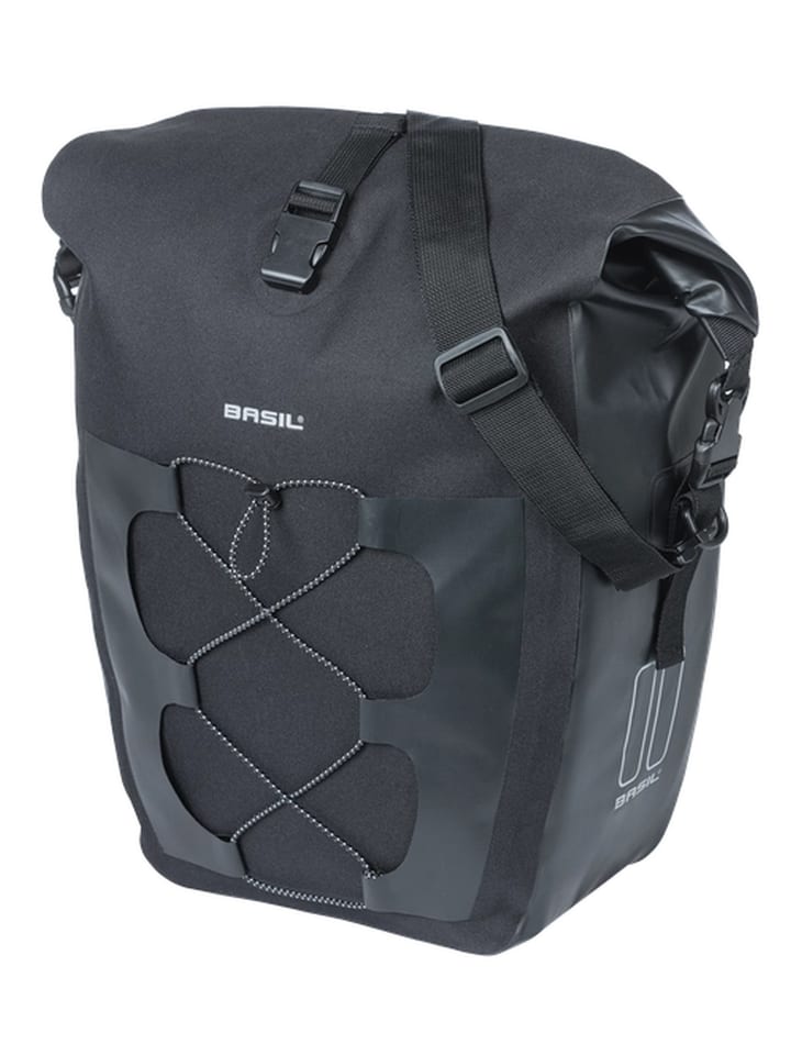 С водонепроницаемой сумкой Basil Navigator вы поднимете планку своих велосипедных приключений на новый уровень. Сумка на 100% водонепроницаема (IPX 3) и имеет объем от 25 до 31 литра, что делает ее идеальной для использования в дороге. Изготовленная из комбинации брезента и полиэстера 600D, она оснащена съемным и регулируемым плечевым ремнем. Нужно положить шлем или мокрую дождевую куртку? Светоотражающая эластичная лента расположена на передней части сумки. Сумка закрывается на рулонную застежку, которую можно свернуть двумя способами: к задней части сумки или сверху. Застежки-кнопки гибкие, поэтому вы можете выбрать тот вариант, который вам больше нравится! Прикрепите сумку к велосипеду с помощью системы крепления Basil Hook On System. Дополнительно сумку можно закрепить на раме велосипеда с помощью регулируемого крючка внизу.