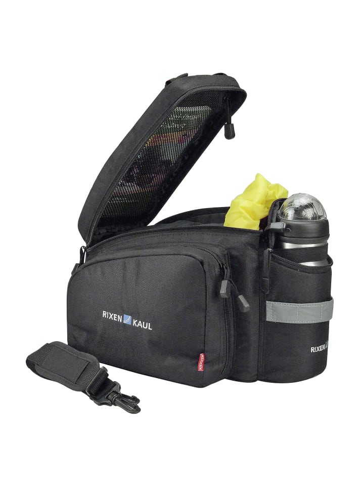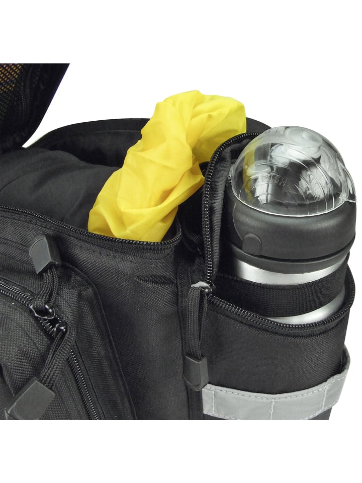 Сумка, сохраняющая свои размеры, с мягкими боковыми стенками и откидными боковыми карманами, один из которых имеет сетчатое отделение. Основное отделение с двойной молнией закрывается дополнительным тканевым клапаном, под которым также можно хранить куртку или свитер. Карман для бутылки на спине можно сложить и закрепить ремешком. Оснащена светоотражателем, держателем для фонаря, ручкой для переноски и дождевым чехлом. (Примечание: откидные боковые карманы не полностью закрываются дождевым чехлом и совместимы только с багажниками, имеющими боковые опоры.) Наши сумки, боксы и тканевые корзины с Uniklip 2 можно использовать на любом багажнике. Отрегулируйте ширину один раз, чтобы она соответствовала вашему багажнику. Прикрепите аксессуары - переверните зажим - закрепите!