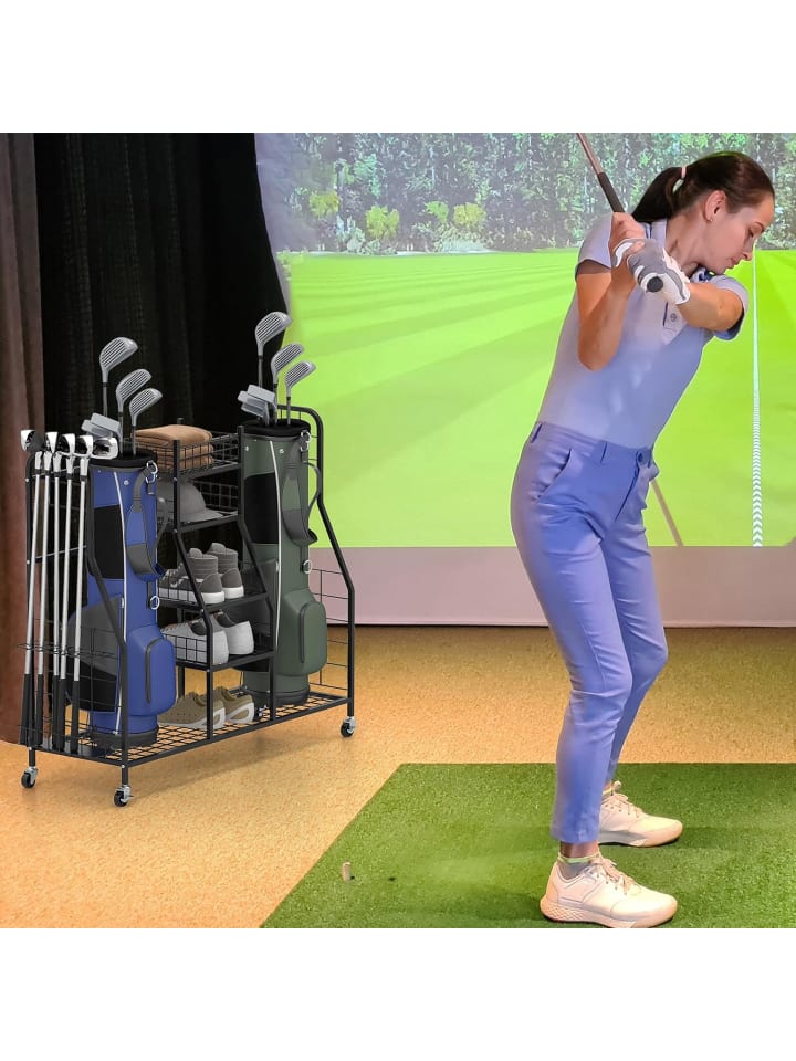 Описание товара: Наслаждайтесь практичным и удобным хранением вашего гольф-оборудования с помощью органайзера для гольф-сумок. Эта прочная металлическая подставка для гольфа предлагает достаточно места для двух гольф-сумок и других аксессуаров для гольфа, таких как мячи, клюшки, обувь, полотенца, кепки и т. д. Боковой держатель для клюшек обеспечивает быстрый доступ к вашим клюшкам и может быть легко установлен как с правой, так и с левой стороны. Четыре универсальных колеса обеспечивают дополнительную мобильность. Два из этих колес имеют фиксаторы, что обеспечивает устойчивость.