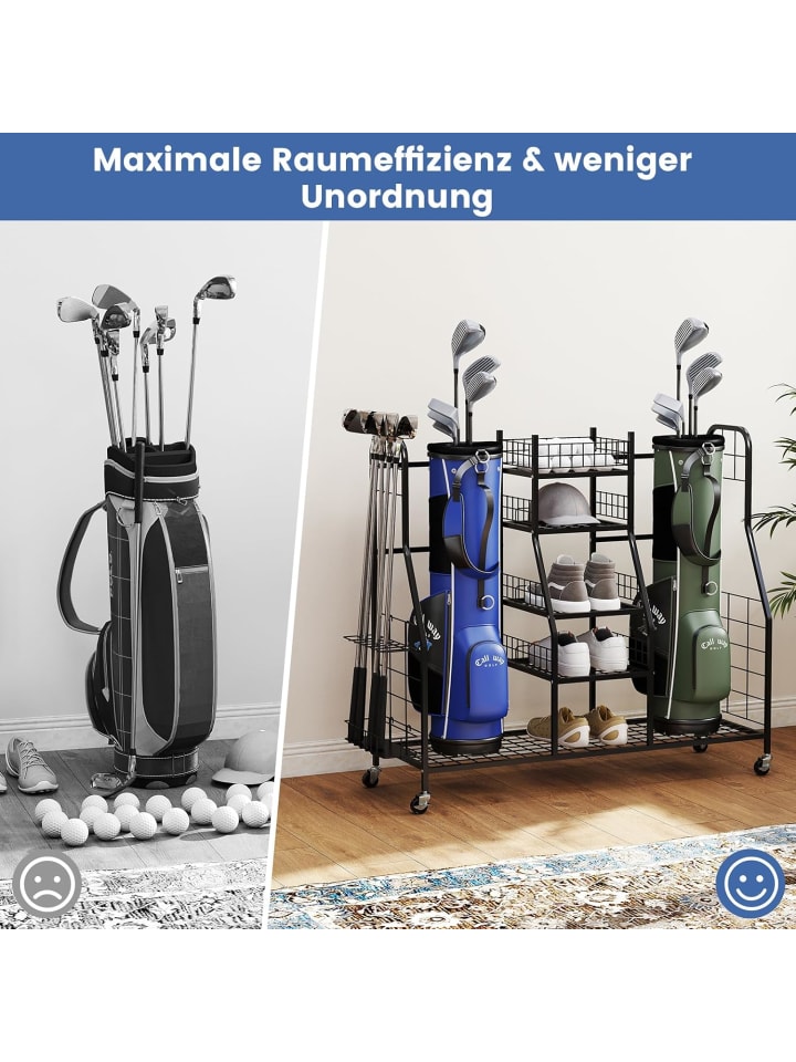 Большое пространство для хранения: 1 корзина, 4 полки и 2 держателя для сумок для гольфа