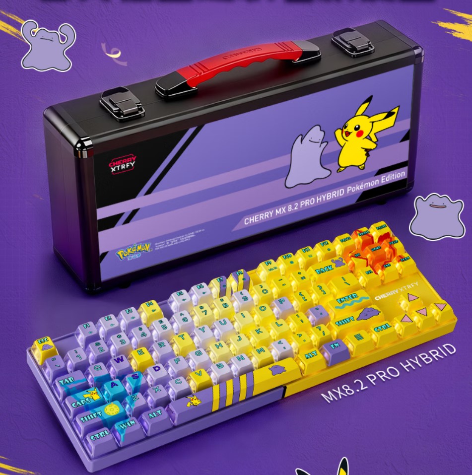 Cherry Xtrfy MX8.2 PRO HYBRID Pokemon Edition представляет собой игровую клавиатуру с беспроводным подключением, в которой используется гибридная система переключателей, включающая в себя механические переключатели MX Lumina Red и магнитные MK Crystal Magnetic. Конструкция клавиатуры обеспечит комфортное использование как в играх, так и при повседневной работе, а для подключения можно использовать три типа подключения - Bluetooth, 2.4 ГГц и проводное USB. Кейкапы выполнены из прочного PBT, а сама клавиатура изготовлена по технологии GASKET. Частота опроса в модели достигает 8000 Гц как в проводном, так и в беспроводном режиме. Основной отличительной чертой является внешний вид - клавиатура выполнена в дизайне покемонов Pikachu и Ditto, а RGB-подсветка с возможностью синхронизации с музыкой лишь подчеркнет необычный дизайн. Время работы от батареи в режиме Bluetooth достигает 310 часов без подзарядки.