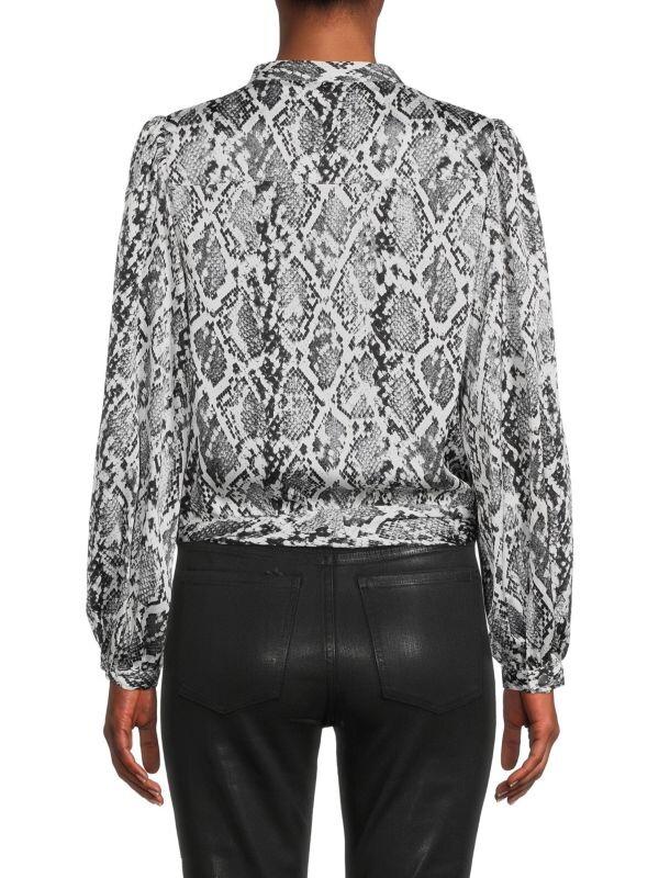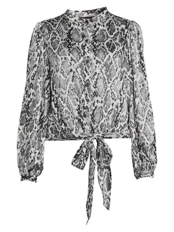 Принт под питона по всей поверхности делает эту женственную блузку особенной. Шикарные пышные рукава и завязка спереди. Воротник-стойка. Длинные пышные рукава. Манжеты на пуговицах. Пуговицы спереди. ГалстукиПереработанный полиэстер и полиэстерМашинная стирка ные