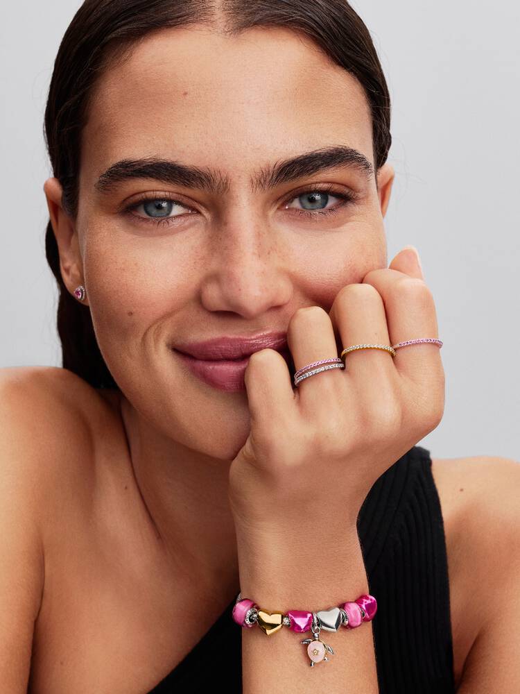 Бесконечное сияние для бесконечной любви. Это кольцо из стерлингового серебра полностью инкрустировано розовыми кубическими циркониями, символизируя нерушимую связь и сияние со всех сторон.