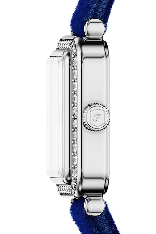 Часы из коллекции Fossil. Эта модель имеет прямоугольный циферблат и текстильный ремешок.