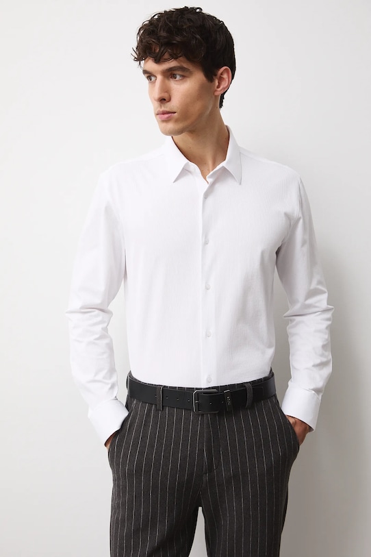 - Рубашка приталенного кроя облегает фигуру, естественно подчеркивая силуэт и обеспечивая комфорт.