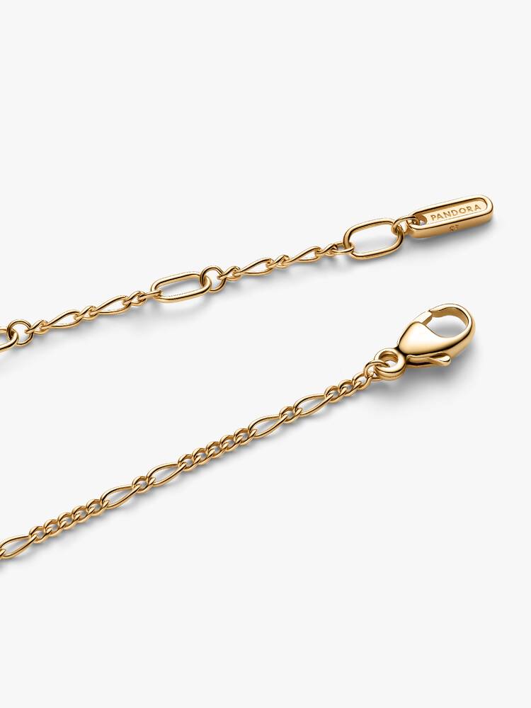 Цельный браслет-цепочка фигаро из золота 14 карат всегда попадает в такт. Чередование коротких и длинных звеньев создает идеальный ритм в любом многослойном образе.