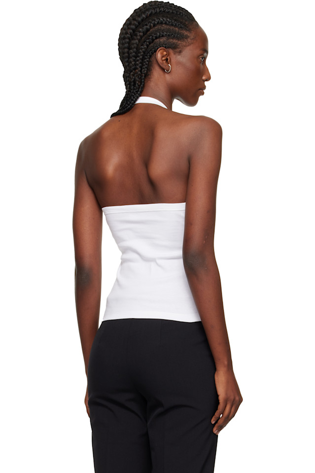 Майка из органического хлопкового трикотажа. Круглый вырез в рубчик и фиксированная бретелька через шею.