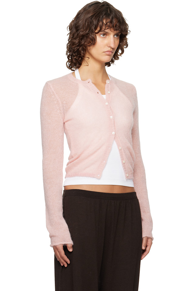 Полупрозрачный кардиган из смеси мохера и альпаки с ажурной вязкой.