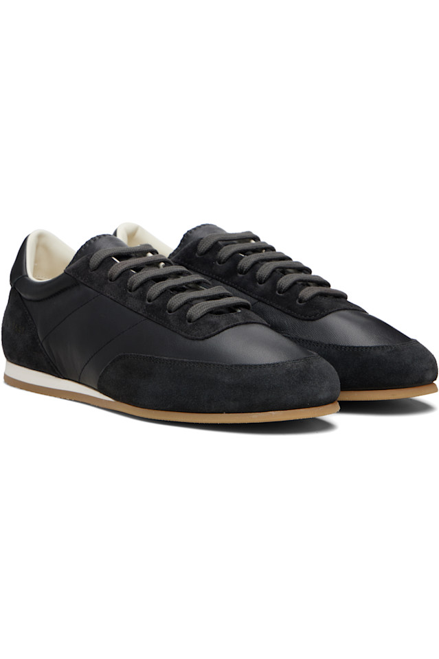 Низкие кеды из полированной телячьей кожи и замши с вставками.
