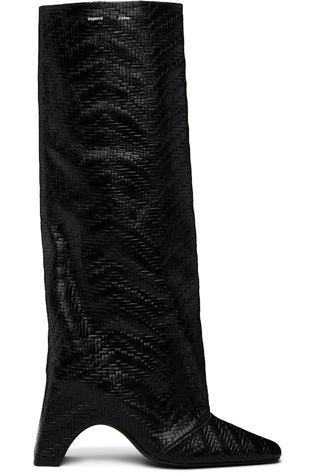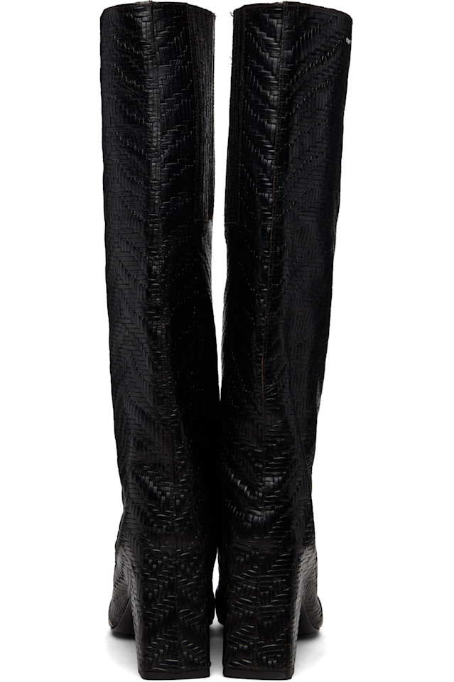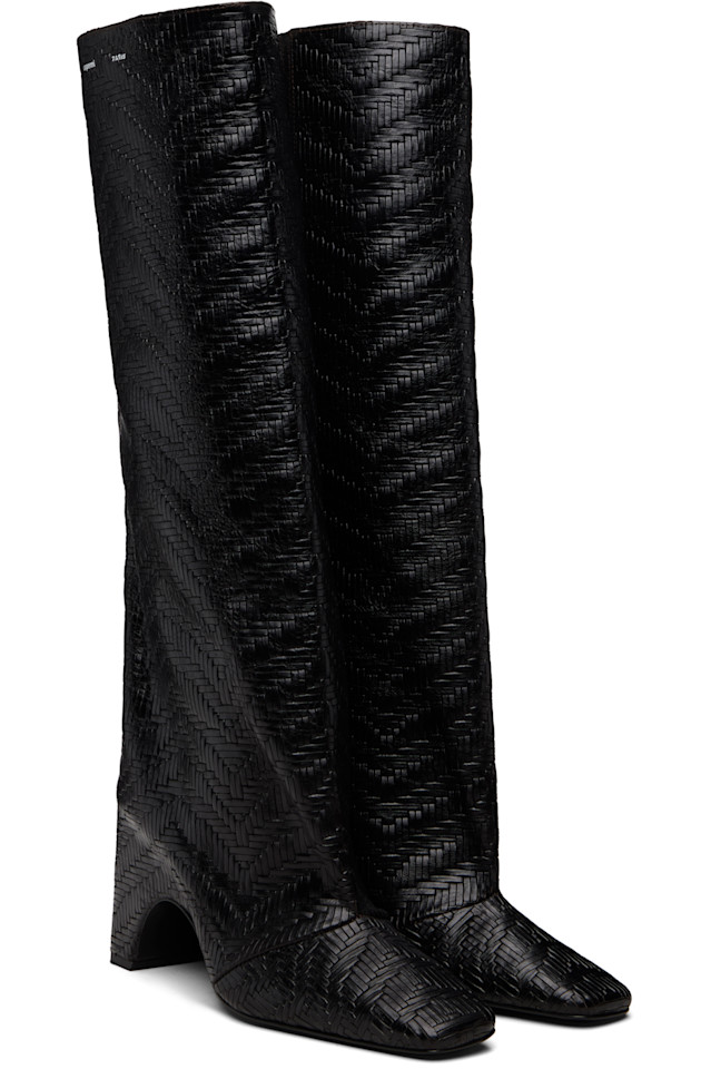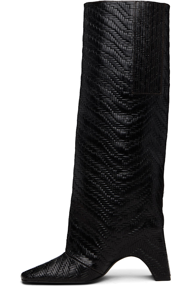 Высокие кожаные сапоги без шнурков, плетеные до колена.