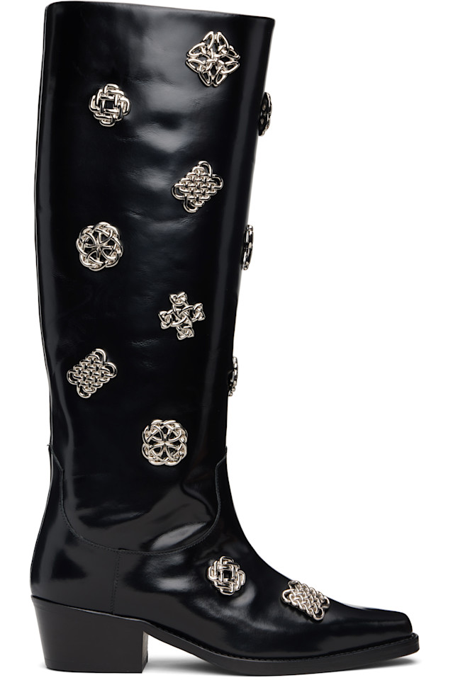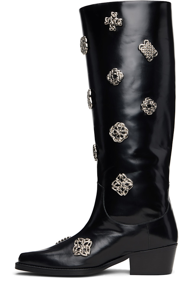 Высокие сапоги до колена из полированной кожи.