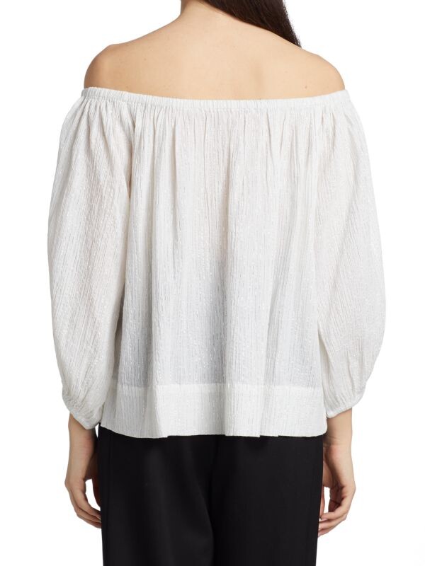 Металлизированная нить придает тонкий блеск этому топу из хлопкового газа с эффектным силуэтом с открытыми плечами. Вырез с открытыми плечами. Рукава-фонарики длиной до браслета с эластичными манжетами. Пуловер