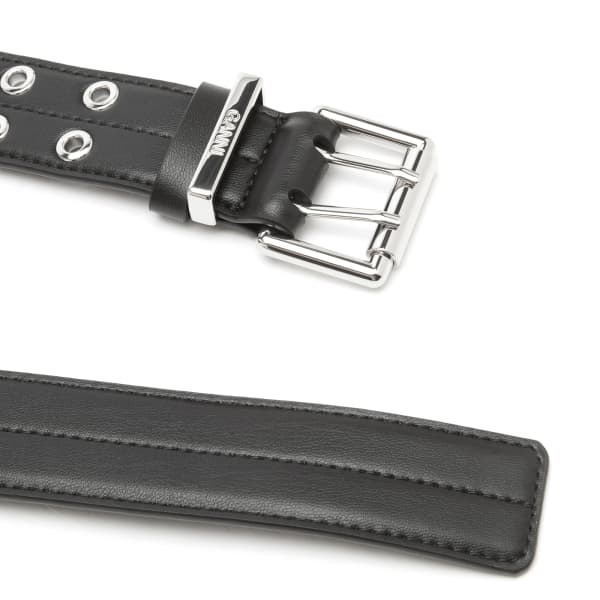 GANNI, копенгагенский бренд, известный своими смелыми дизайнерскими решениями, представляет пояс с двойными люверсами. Изготовленный из смеси переработанной кожи с зернистой отделкой, он украшен серебристыми люверсами и застежкой-пряжкой для регулировки размера. Двойные люверсы придают поясу индустриальный стиль, а фурнитура с выгравированным логотипом добавляет изысканности.