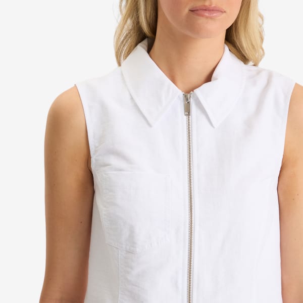 Жилет Sariana от датского бренда Samsøe отличается лаконичным современным дизайном, приталенным кроем, воротником рубашечного типа и передним накладным карманом. Изготовленный из смеси органического хлопка, нейлона и льна, он имеет практичную двустороннюю молнию и минималистичный вид - в соответствии со скандинавскими корнями бренда в функциональной и экологичной моде.