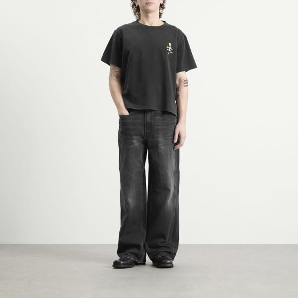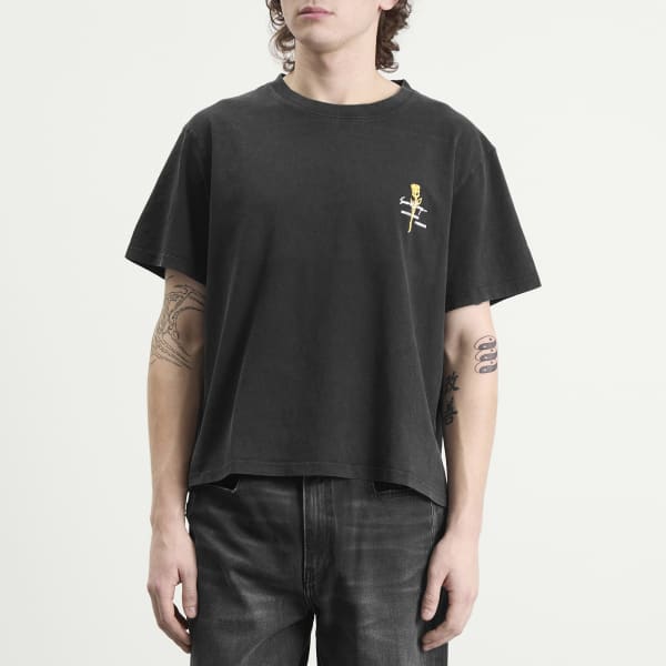 Эта футболка Second Layer, созданная в 2013 году и сочетающая в себе элементы скейтбординга и серфинга, имеет свободный, но укороченный крой. Винтажный эффект и принт вдохновлены мексиканским телешоу «La Rosa de Guadalupe».