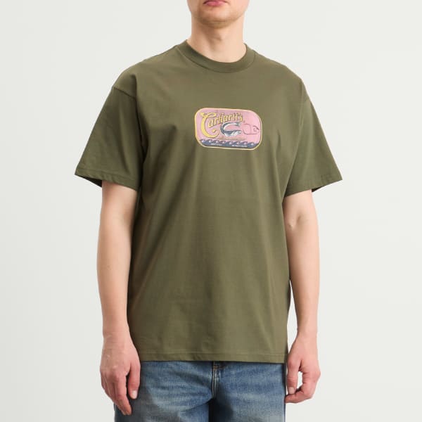 Сюрреалистический взгляд на повседневность. Футболка Sardinas от Carhartt WIP превращает обычную консервную банку из-под сардин в произведение поп-арта, дополненное прыгающей розовой рыбкой и волнообразными мотивами, расплывающимися на залитом солнцем фоне. Это игривое столкновение обыденного и фантастического - напечатано на мягком оливковом хлопке для более реалистичного эффекта.