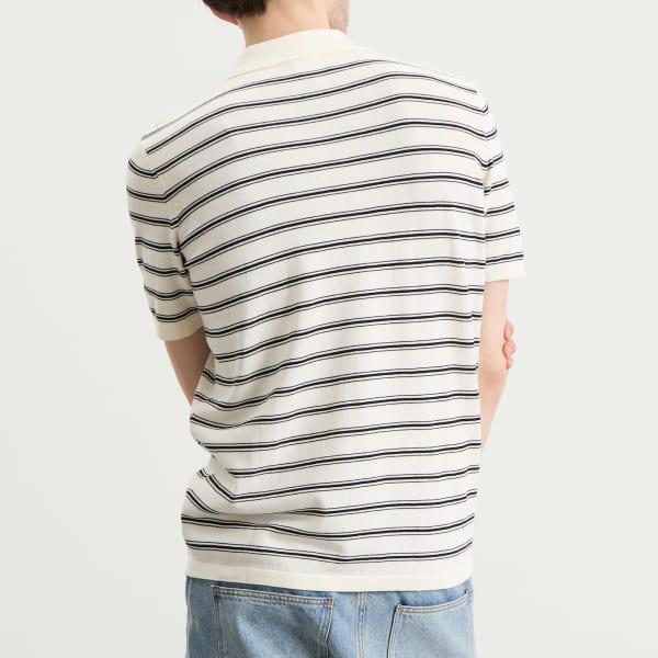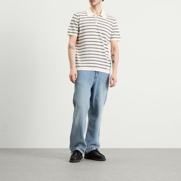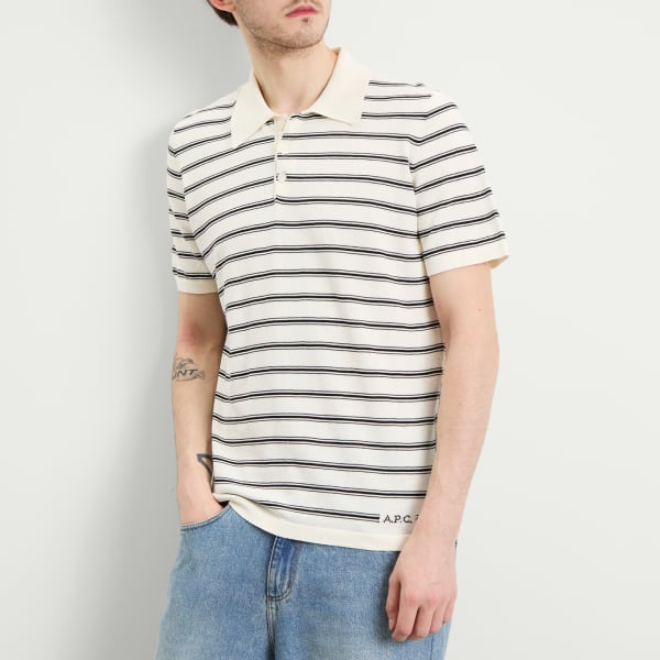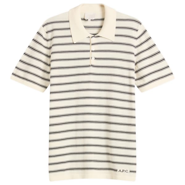 APC переосмысливает классическую рубашку поло в минималистичном парижском стиле. Эта модель с коротким рукавом, сшитая из мягкого хлопка, отличается четкими горизонтальными полосами на кремовой основе, сочетая ретро-спортивные элементы с современной простотой. Застежка на три пуговицы и ребристый воротник сохраняют традиционный стиль, а тканая фирменная этикетка на подоле добавляет едва уловимую изюминку.